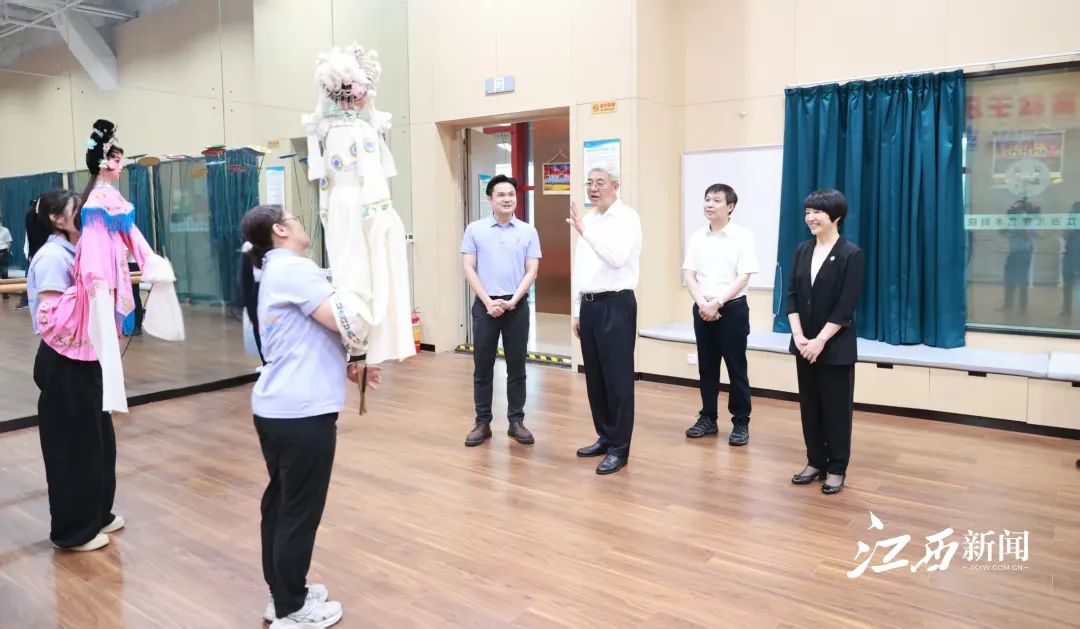 尹弘来到省话剧团,认真听取经营发展、获奖剧目等情况介绍。剧场内演员正在排练沉浸式剧目《那年老街》。尹弘认真观摩,称赞演员表演到位、感染力强。他说,话剧是戏剧舞台艺术中的重要门类,要用精良的作品、精湛的表演吸引观众、打动观众,生动记录时代变迁,激发正能量、传递真善美。江西文演集团正在盘活老文艺院团资源,全力打造文化演艺新业态聚集区,尹弘要求加强传统建筑?;?,加快文旅融合发展,深入挖掘传统文化的当代表达,切实做活“以文塑旅、以旅彰文”的文章。