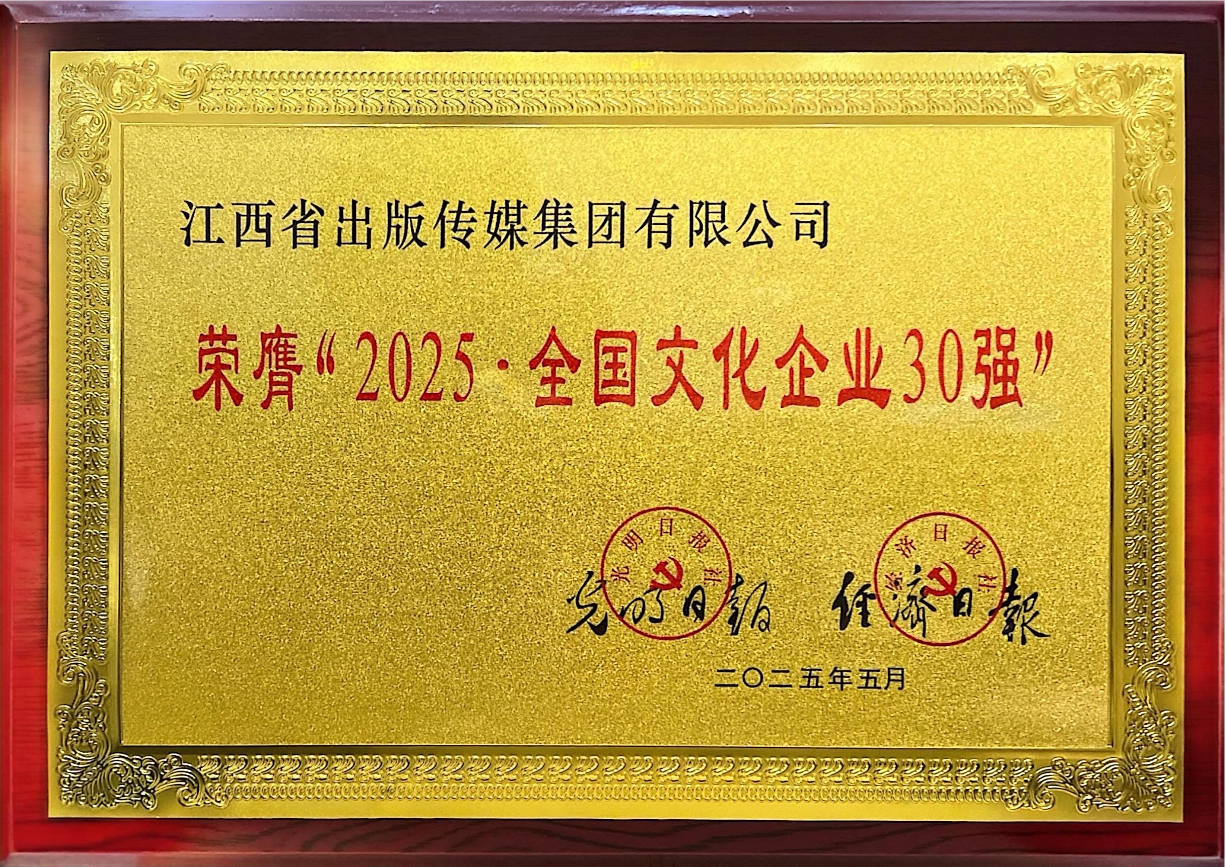 5月26日,光明日报社与经济日报社联合发布“2025?全国文化企业30强”(以下简称30强)名单。江西省出版传媒集团有限公司(以下简称集团公司)再度荣登榜单,连续十七届获得这一殊荣。